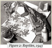 Escher produced 448 lithographs, woodcuts, and wood engravings and over 2000 drawings and sketches during his lifetime (1). His understanding of mathematics was largely visual and intuitive, and his works display a strong mathematical component (6). More than 150 of colorful works testify to his ingenuity in regular division of plane. He was very successful at depicting the real world in 2-dimensional plane as well as at translating the principles of regular division onto a number of 3-dimensional objects such as spheres, columns, and cubes. Some of his prints combine both 2 and 3-dimensional images with a startling effect as demonstrated in “Reptiles” (7).
