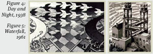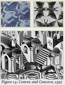 Another famous work by Escher, “Convex and Concave,” exemplifies his “impossible reality” works. The essential idea that governs the entire lithograph is the Islamic tumbling baby block pattern, which appears in the flag on the upper right side. Although the picture, as a whole, seems to portray a normal scene, it actually consists of multi-purpose planar surfaces. Depending on the location upon which the eye focuses, the same planes may serve as ceilings, walls, or floors. Escher’s “Waterfall,” “Ascending and Descending,” “Relativity,” and “House of Stairs” all present similar mind-boggling characteristics (2).