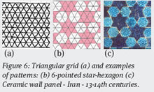 Figure 6: Triangular grid (a) and examples of patterns: (b) 6-pointed star-hexagon (c) Ceramic wall panel - Iran - 13-14th centuries.